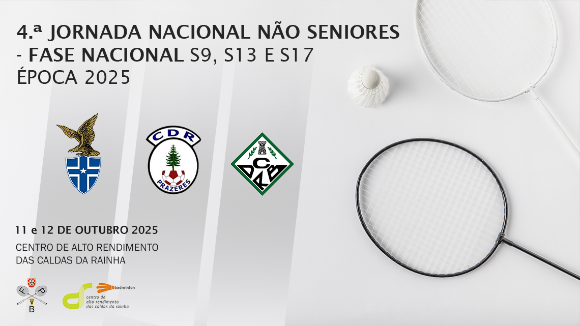 Decorreu este fim de semana, 11 e 12 de outubro 2025, no Centro de Alto Rendimento das Caldas da Rainha - Joaquim Lopes, a 4.ª Jornada Nacional Não Seniores S9, S13 e S17, prova do calendário oficial da Federação Portuguesa de Badminton.