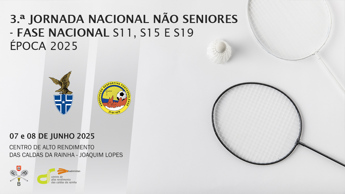 Decorre este fim de semana, 7 e 8 de junho 2025, no Centro de Alto Rendimento das Caldas da Rainha - Joaquim Lopes, a 3.ª Jornada Nacional Não Seniores S11, S15 e S19, prova do calendário oficial da Federação Portuguesa de Badminton.
