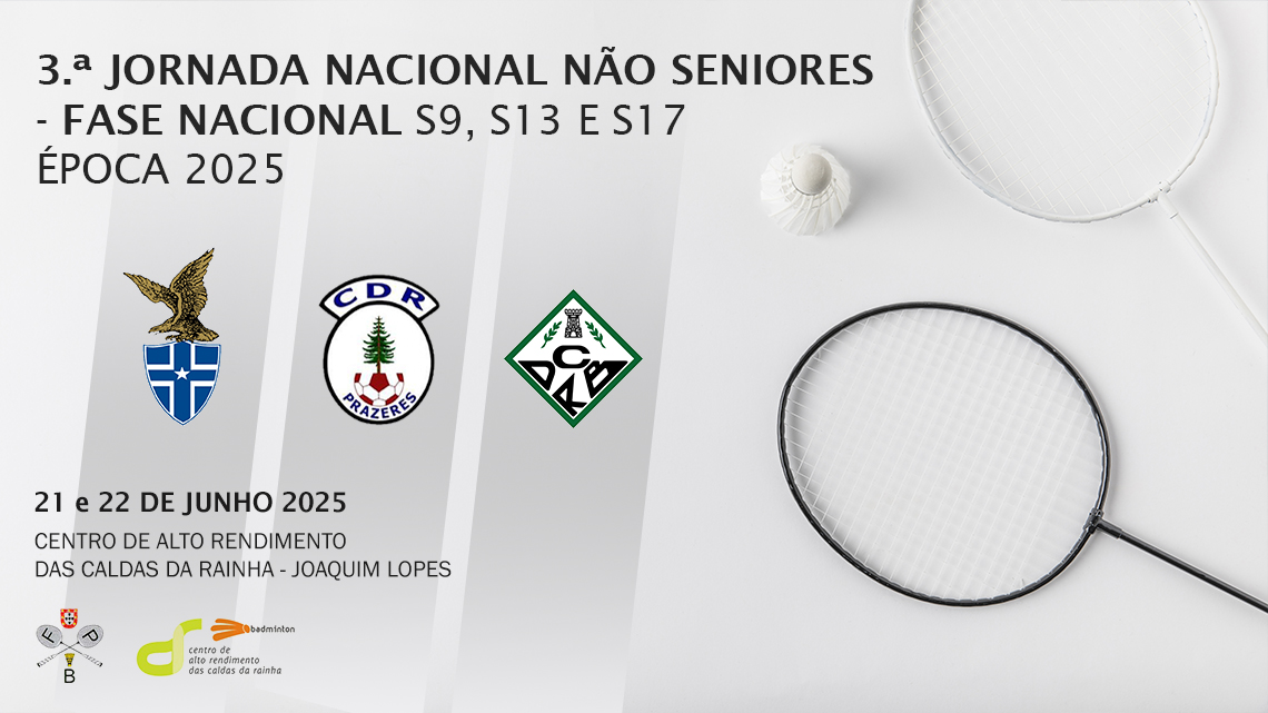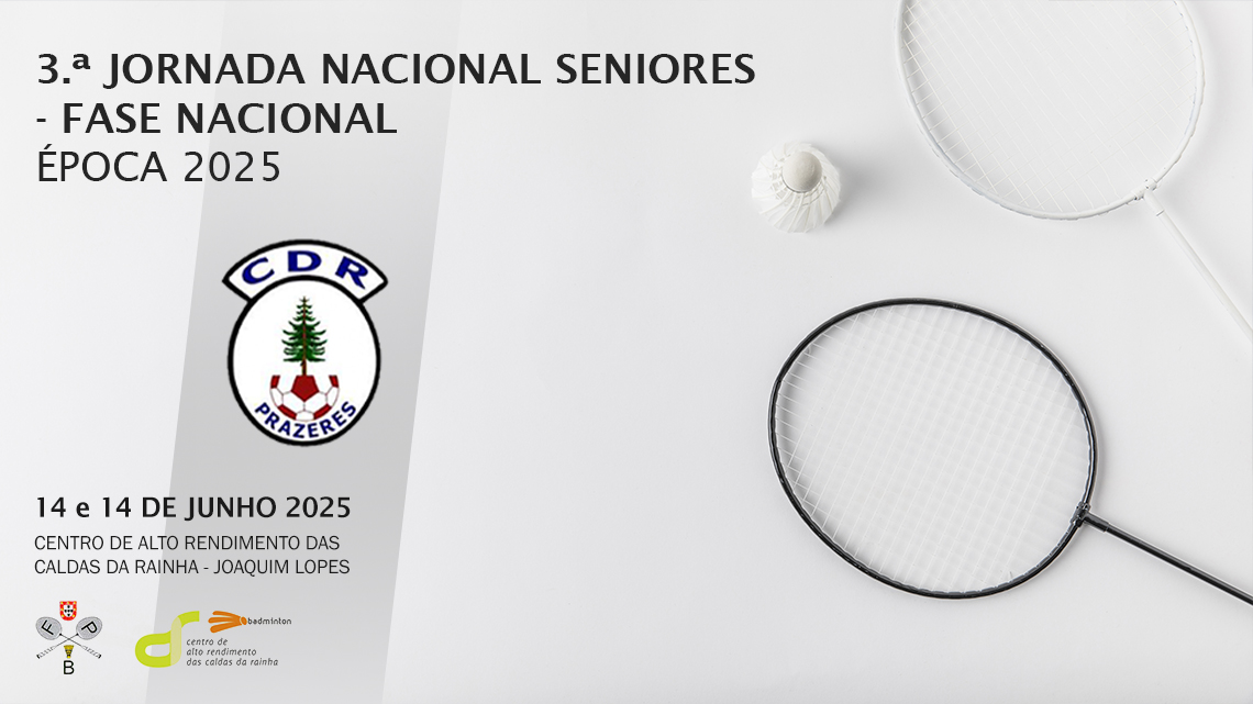 Decorre este fim de semana, 14 e 15 de junho 2025, no Centro de Alto Rendimento das Caldas da Rainha - Joaquim Lopes, a 3ª Jornada Nacional Seniores - Fase Nacional Época 2025, prova do calendário oficial da Federação Portuguesa de Badminton.