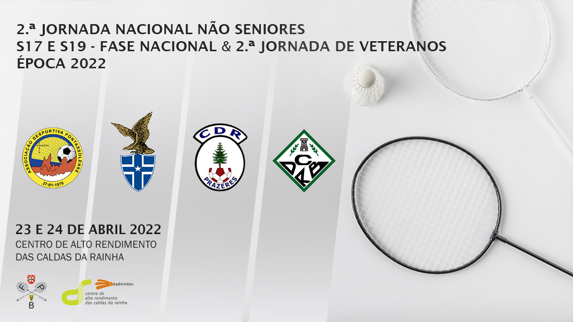Decorre este fim de semana, 23 e 24 de Abril 2022, no Centro de Alto Rendimento das Caldas da Rainha, a 2.ª Jornada Nacional Não Seniores S17, S19 e 2.ª Jornada de Veteranos Época 2023, provas do calendário oficial da Federação Portuguesa de Badminton.