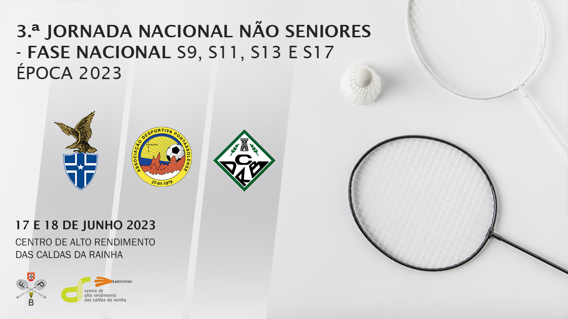 Decorre este fim de semana, 17 e 18 de junho 2023, no Centro de Alto Rendimento das Caldas da Rainha, a 3.ª Jornada Nacional Não Seniores S9, S11, S13 e S17, prova do calendário oficial da Federação Portuguesa de Badminton.
