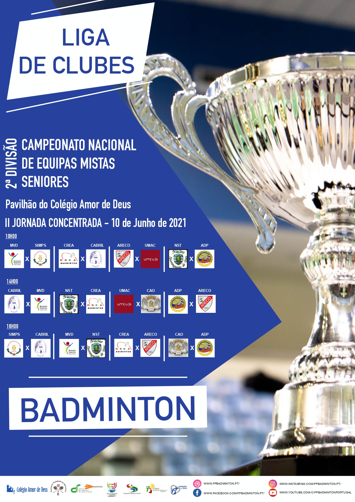 Realiza-se esta quinta-feira, 10 de Junho 2021, Pavilhão Desportivo do Colégio Amor de Deus - Cascais, a 2.ª Jornada da Liga de Clubes - Campeonato Nacional de Equipas Mistas Seniores, 2.ª Divisão, provas do calendário oficial da FPB, com o apoio à organização do Colégio Amor de Deus.