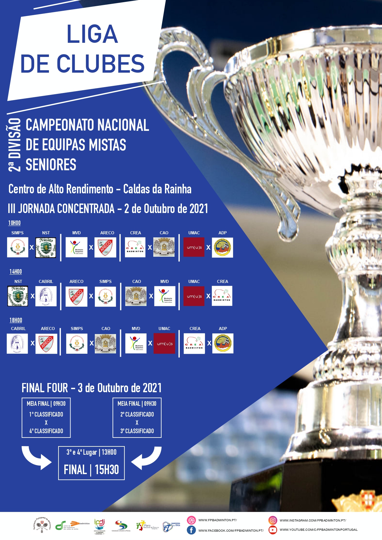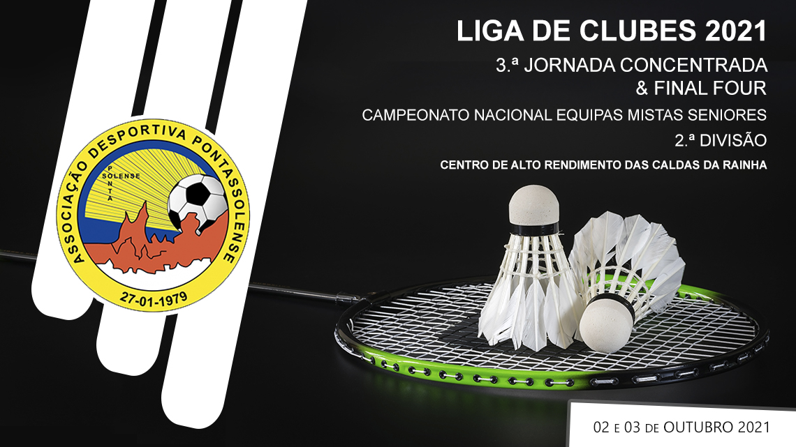 Realiza-se este fim-de-semana, 02 e 03 de Outubro 2021, no Centro de Alto Rendimento das Caldas da Rainha, a 3.ª Jornada Concentrada e a Final Four - Liga de Clubes - Campeonato Nacional de Equipas Mistas Seniores, 2.ª Divisão, provas do calendário oficial da Federação Portuguesa de Badminton.