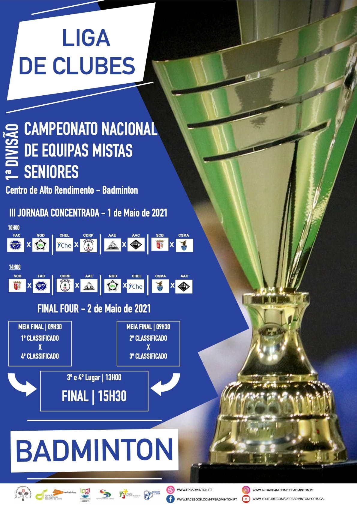 Realiza-se este fim-de-semana, 01 e 02 de Maio 2021, no Centro de Alto Rendimento de Caldas da Rainha, a Liga de Clubes Época 2021 - 3.ª Jornada Concentrada e a Final Four - Liga de Clubes - Campeonato Nacional Equipas Mistas Seniores, provas do calendário oficial da Federação Portuguesa de Badminton.