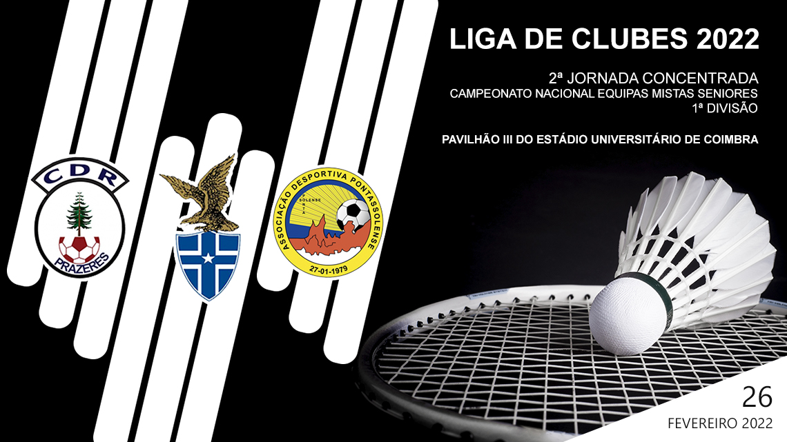 Realiza-se este sábado, 26 de Fevereiro 2022, no Pavilhão III do Estádio Universitário de Coimbra, em Coimbra, a 2.ª Jornada da Liga de Clubes - Campeonato Nacional de Equipas Mistas Seniores, 1.ª Divisão, provas do calendário oficial da Federação Portuguesa de Badminton.